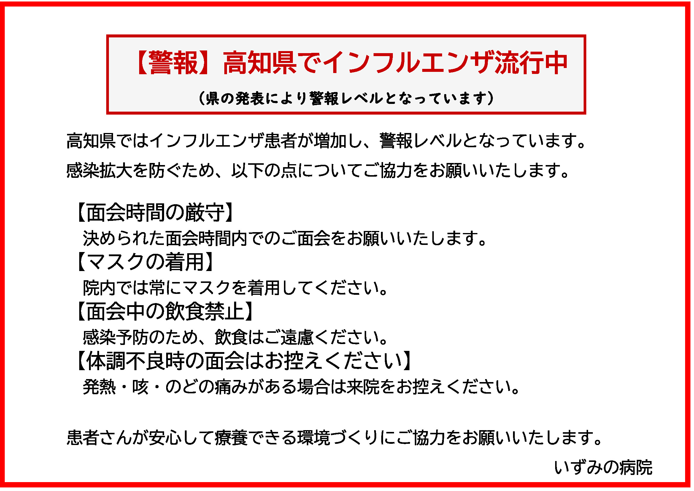 ホーム入院のご案内面会について 面会について 面会時のお願い 面会をされる方は下記の内容をご確認いただき、不織布マスクの着用をお願いいたします。 面会時間 14:00~16:00(平日および土・日・祝日) 1日1回15分以内 面会人数 2名以内(中学生以上の方) 原則、ご家族の方 同居または身の回りのお世話をしている方 病院への出入りの際は 手指消毒の徹底 不織布マスク着用の徹底 総合受付にある「いずみの病院 入館受付票」にご記入のうえ、入館証を着用ください。 面会時の注意事項 感染症対策などで面会を制限させていただく場合がございます。 各病棟の面会状況をご確認ください。 発熱や風邪症状・嘔吐・下痢など感染症症状の方 10日以内に新型コロナウイルス感染症に罹患された方 5日以内に新型コロナウイルス感染症の方と接触歴のある方 面会に来られた際は、各階のスタッフセンターにお声がけください。 発熱、風邪症状のある方は面会をお断りさせていただきます。 面会中の飲食はお断りしています。 面会場所 各フロアの談話ホール 個室は病室内で面会できます。 大部屋で移動できない患者さまの面会は、カーテンを引いて面会ください。 外来エリアでの面会はお断りしております。 3階病棟 面会できます 4階病棟 面会できます 5階病棟 面会できます 6階病棟 面会できます 2025年12月29日更新 入院のご案内 入退院について 入院費用・会計について 面会について 病状説明について 病棟案内 入院パンフレット(PDF)