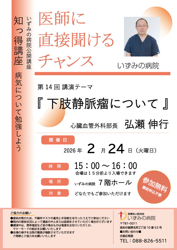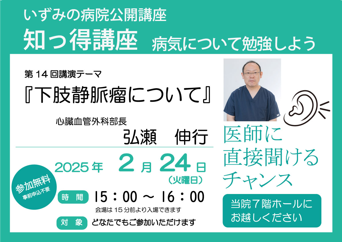 ホームお知らせいずみの病院 公開講座 2026年2月26日(火)開催 2025.12.25 いずみの病院 公開講座 2026年2月26日(火)開催 いずみの病院公開講座、 心臓血管外科部長 弘瀬が登壇し開催いたします。是非ご参加ください。詳しくはこちら 前ページ カテゴリー 新着情報 外来情報 イベント 採用情報 記事アーカイブ 月を選択 2025年12月 2025年11月 2025年10月 2025年9月 2025年8月 2025年6月 2025年5月 2025年4月 2025年3月 2025年2月 2024年10月 2024年9月 2024年6月 2024年4月 2024年3月